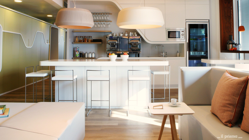 L’entreprise II Prisma a ainsi analysé les spécificités propres à chaque pays afin de créer une réelle expérience d’immersion dans la culture de ce dernier. Les bureaux de Milan avait pour thème principale « la transformation » et ont été conçu autour de cinq lieux chers aux italiens : le théâtre, la cave à vin, le restaurant, le jardin et l’atelier de confection. Le jardin sensoriel permet aux employés de se retrouver lors de séances informelles. C’est aussi un endroit propice au brainstorming et à la relaxation. Le restaurant offre une ambiance décontractée représentant bien le style de vie italien.